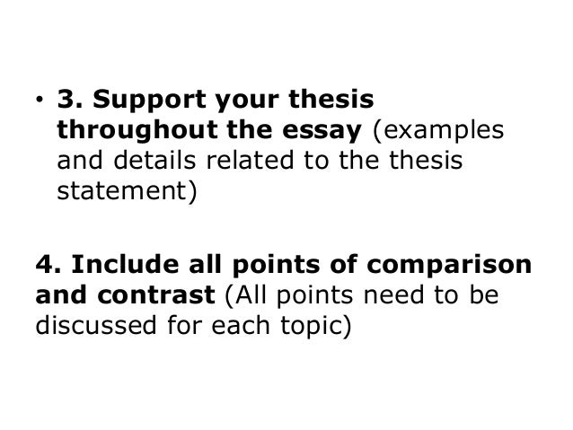 A comparison essay notes either similarities, or similarities and differences • A contrast essay notes only differences • The comparison or contrast should make
